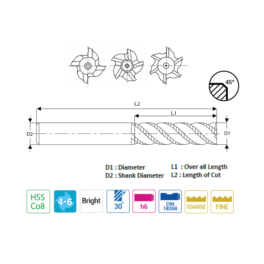 YG ดอกเอ็นมิล HSS Co8 4–6 ฟัน รุ่นกัดหยาบยาว (E2759xxx)